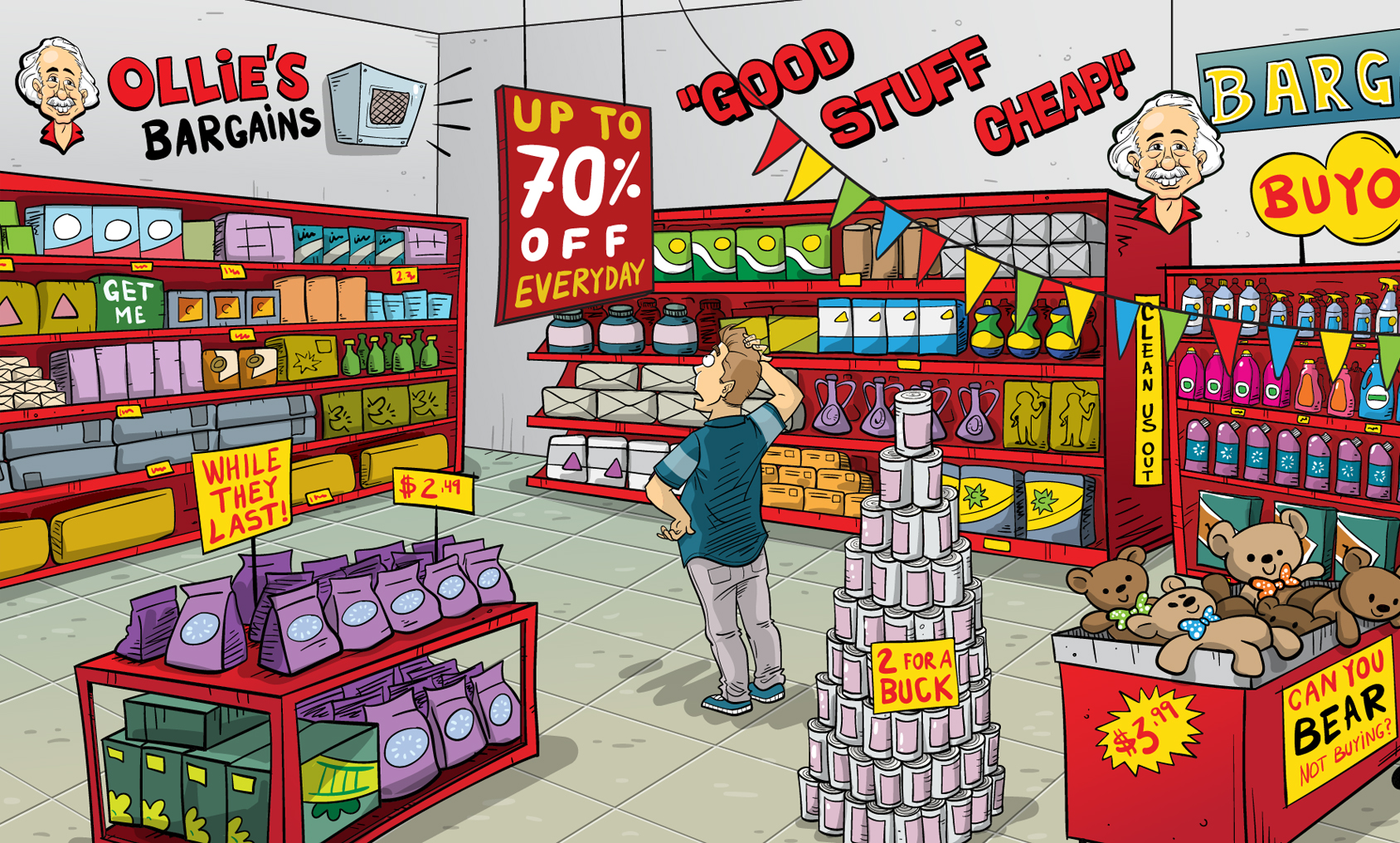 The refreshed character design resonated strongly with the brand, ultimately leading to the illustrator behind the updated look being hired by Ollie’s on a continuing basis to create new character artwork for the company each month.